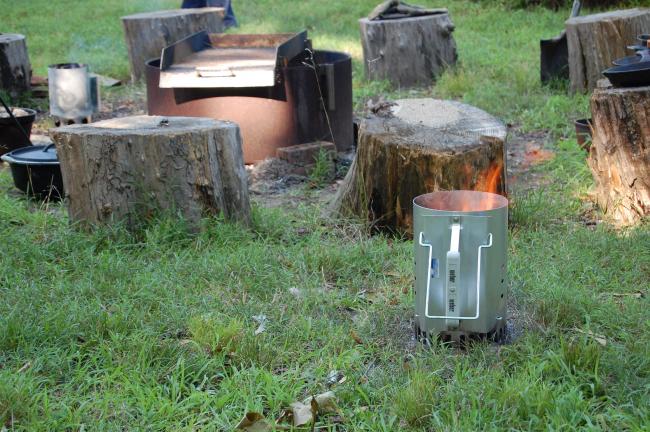 A "chimney," a container approximately the size in diameter of a Number 10 can and which can be substituted for a commercial chimney with air holes in the bottom, is used to heat the charcoal to a char stage. It needs only some crumbled paper in the bottom to preheat the charcoal.
