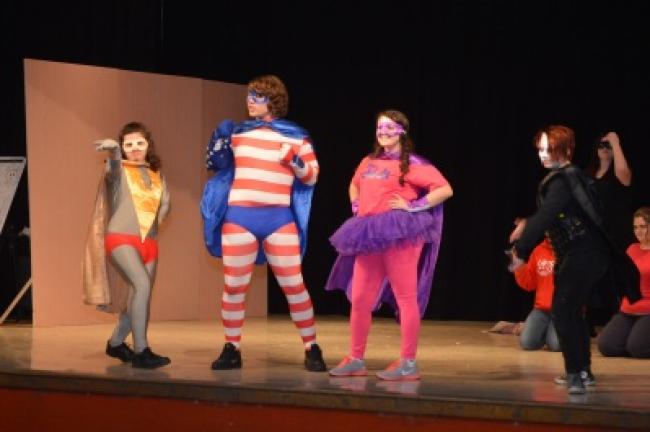 Team Justice, which consists of William Bernstein, Jordan Reis, Megan Heckman and Amarynth Ruch, face off against villains turned politicians in this year's Panther Valley High School Drama production. CHRIS REBER/TIMES NEWS