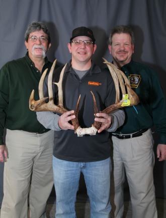• Ron Shaulis holding his record-breaking typical whitetail deer rack taken with a compound bow on Oct. 24, 2017. L to R: Official Boone and Crockett Club scorer Ray Brugler, Ron, and Game Commission Big-Game Scoring Program Coordinator and official B&C Club scorer Bob D’Angelo
